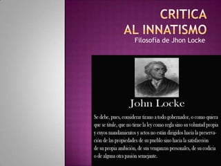 La filosofía de John Locke se basa en rechazar la idea innatista de que existen ideas o principios innatos en la mente humana. Locke argumenta que no existe un consenso universal sobre principios como la idea de Dios o los principios morales, y que todas las ideas proceden de la experiencia a través de la sensación o la reflexión. La mente es inicialmente una tabla rasa que recibe ideas simples de los sentidos y luego forma ideas complejas al combinar las simples.