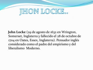 John Locke (1632-1704) fue un filósofo inglés considerado el padre del empirismo y el liberalismo moderno. Nació en Inglaterra y estudió en la Universidad de Oxford, donde se convirtió en profesor de griego y retórica. Sus obras más influyentes incluyen Ensayo sobre el entendimiento humano y Ensayos sobre el gobierno civil, en las que propuso que la soberanía emana del pueblo y defendió los derechos naturales a la vida, la libertad y la propiedad, influyendo en pensadores