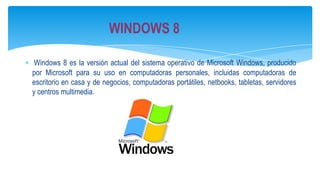 Este documento describe Windows 8 y Linux como sistemas operativos. Windows 8 es producido por Microsoft para computadoras personales y dispositivos móviles, con una interfaz optimizada para pantallas táctiles. Linux es un sistema operativo libre y de código abierto que es multiusuario, multitarea y compatible con múltiples plataformas. También describe brevemente a Mac OS X, el sistema operativo de Apple, como el sucesor de Mac OS 9.