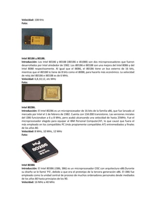 Este documento presenta resúmenes breves de varios microprocesadores importantes producidos por Intel a lo largo de los años, incluyendo el Intel 4004 (el primer microprocesador en un chip), el Intel Pentium (que introdujo la quinta generación de procesadores x86), y el Intel Core 2 Quad (que presentó una arquitectura de doble núcleo). Cada entrada incluye una introducción breve al procesador, su velocidad de reloj y una fotografía. El documento proporciona una línea de tiempo concisa de los hitos