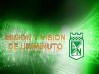 El documento presenta la misión y visión del Sistema Universitario UNIMINUTO. Su misión es ofrecer educación superior de alta calidad, formar profesionales competentes y éticamente orientados, y construir un país justo y en paz. Su visión para el 2012 es ser reconocido por sus vivencias espirituales, su aporte al desarrollo a través de la educación, la calidad de sus programas, y sus amplias relaciones nacionales e internacionales.