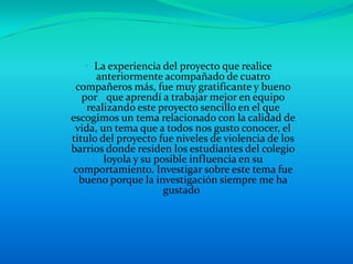 El estudiante realizó un proyecto de investigación con sus compañeros sobre los niveles de violencia en los barrios donde viven los estudiantes y su posible influencia en su comportamiento. La experiencia le permitió aprender a trabajar mejor en equipo y explorar un tema que le interesaba. Al concluir la investigación y sacar resultados, se sintió satisfecho de haber respondido sus propias curiosidades. Lo que más disfrutó fue presentar el proyecto terminado ante la comunidad estudiantil.