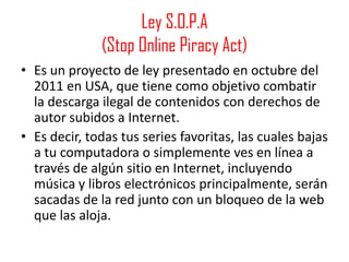 El documento presenta información sobre varias leyes y propuestas relacionadas con los derechos de autor en Internet, como la Ley SOPA, la Ley PROTECTIP y el Acuerdo ACTA. También define qué es hardware, menciona ejemplos de sistemas operativos y tipos de software como procesadores de texto y presentaciones.