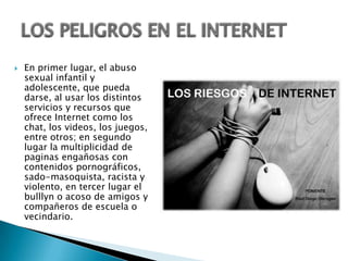 Este documento presenta estadísticas sobre los riesgos que enfrentan los menores en Internet, como el abuso sexual, contenido inadecuado y acoso cibernético. Menciona que aproximadamente 1 de cada 7 menores recibe solicitudes sexuales en línea cada año y solo el 27% le informa a sus padres sobre material sexual no deseado. También expone que el 9% de los jóvenes son acosados en línea y el 34% se expone a contenido sexual sin consentimiento.