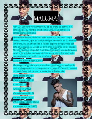 Este documento presenta un resumen biográfico de Maluma, un cantante y compositor colombiano. Detalla que nació en 1994 en Medellín, Colombia y creció practicando fútbol y otros deportes. También tenía una pasión por la música desde temprana edad. Explica que su estilo musical mezcla reguetón con otros géneros urbanos y ha sido influenciado por Justin Timberlake. Finalmente, incluye una lista de sus canciones como artista principal y secundario entre los años 2011 y 2016.