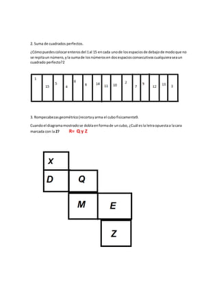 El documento presenta 4 problemas de lógica y razonamiento matemático. El primero involucra asociar triángulos y cuadrados numerados sin que las líneas se crucen. El segundo pide colocar números del 1 al 15 sin repetir en espacios, donde la suma de números adyacentes sea un cuadrado perfecto. El tercero es un rompecabezas geométrico que forma un cubo con letras opuestas. El cuarto continúa un patrón numérico para encontrar el número 289.