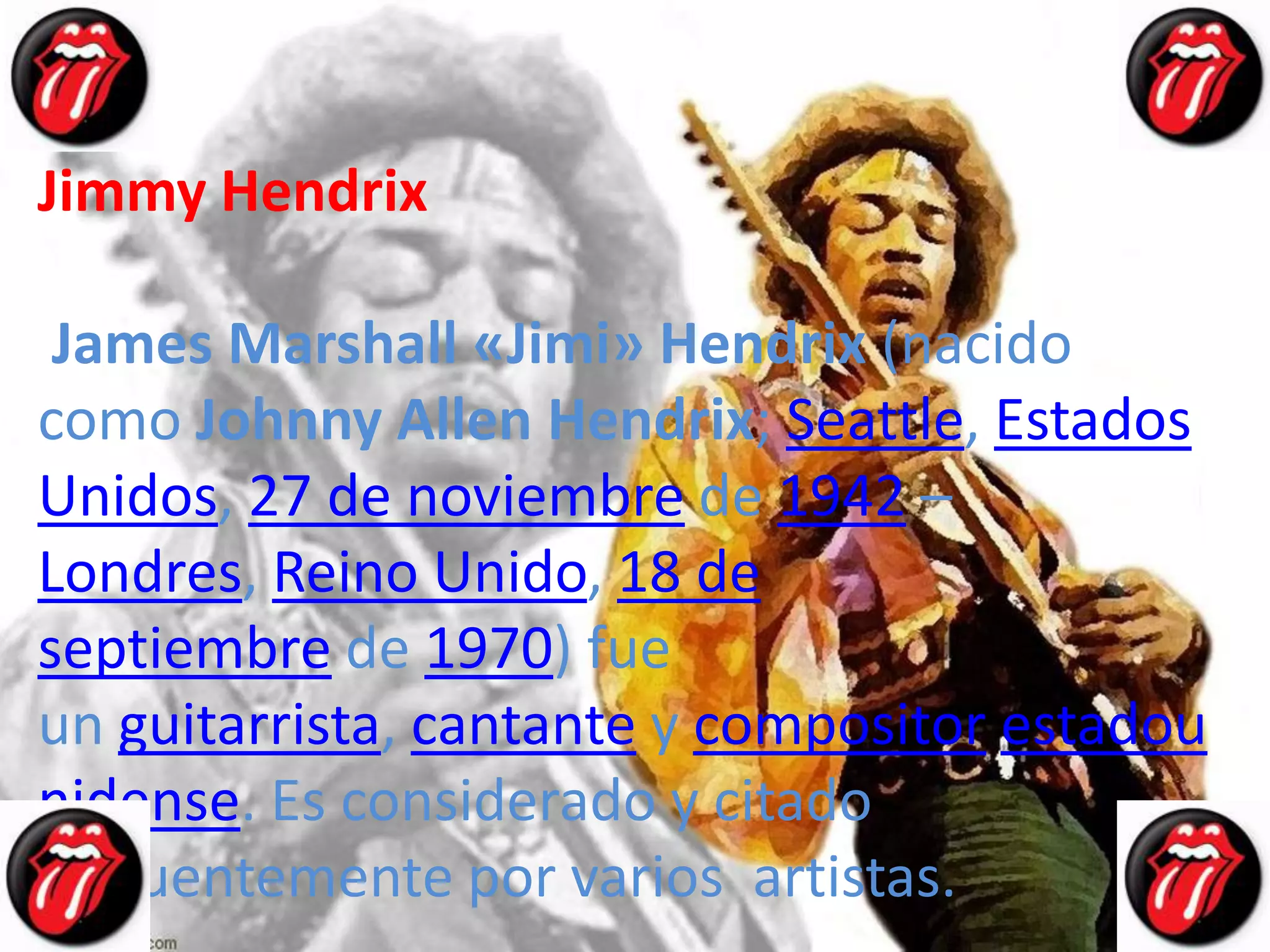 Jimi Hendrix fue un legendario guitarrista, cantante y compositor estadounidense conocido por revolucionar el rock con su estilo innovador y su dominio de la guitarra eléctrica. La música se define tradicionalmente como el arte de organizar sonidos y silencios mediante melodía, armonía y ritmo, aunque las definiciones han evolucionado para incluir obras fronterizas. La música es un producto cultural que busca provocar una experiencia estética en el oyente y expresar sentimientos a través de sonidos, aunque cumple func