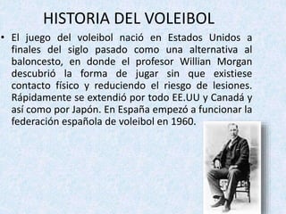 El documento resume la historia y las reglas básicas del voleibol. El voleibol fue creado a finales del siglo XIX como una alternativa menos violenta al baloncesto. Consiste en que dos equipos de seis jugadores se pasen un balón por encima de una red intentando que caiga en el campo contrario. Las reglas principales son que cada equipo solo puede pegarle al balón tres veces antes de devolverlo y no se puede pegar dos veces seguidas.
