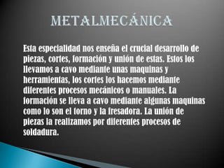 Este documento describe los aspectos fundamentales de la especialidad de metalmecánica. Explica que la metalmecánica enseña el desarrollo, corte, formación y unión de piezas metálicas utilizando máquinas y herramientas. También describe algunos ejemplos prácticos realizados como la fabricación de marcos de segueta y llaves para torno. Finalmente, resalta la importancia de la seguridad en el taller utilizando equipos de protección personal.