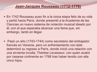 Jean-Jacques Rousseau tuvo una vida controvertida. Nació en Ginebra en una familia protestante de bajos recursos. Trabajó en varios oficios y recibió educación gracias a la protección de Mme. De Warens. En París publicó obras filosóficas que lo hicieron famoso pero también controvertido, como El contrato social y Emilio. Pasó sus últimos años cambiando constantemente de residencia, acosado por la paranoia.