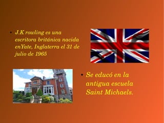 J.K. Rowling nació en Inglaterra en 1965 y se educó en la escuela St. Michaels. Trabajó en Amnistía Internacional y como profesora de inglés en Portugal, donde nació su hija. Regresó a Inglaterra y escribió las primeras ideas de Harry Potter mientras cuidaba a su hija. Doce editoriales rechazaron su manuscrito antes de que Bloomsbury lo publicara en 1995, lanzando su exitosa serie de siete libros de Harry Potter que la convirtieron en una de las personas más ricas del mundo.