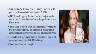 J.K. Rowling nació en Reino Unido en 1965 y es una escritora, productora y filántropa conocida por ser la autora de la exitosa serie de libros de Harry Potter. Además de escribir, ha fundado organizaciones benéficas para apoyar a familias monoparentales y la investigación de la esclerosis múltiple, y se ha convertido en la mujer más rica de Gran Bretaña gracias al éxito de sus libros publicados bajo su seudónimo JK Rowling.