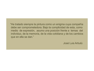 José Luis Arbulú es un pintor peruano nacido en 1957. Se ha desempeñado como profesor de pintura y ha expuesto su obra en numerosas galerías de arte en Perú y el extranjero. Su trabajo explora temas como la memoria, la vida cotidiana y los cambios individuales a través de símbolos encriptados y una estética influenciada por su estudio en China. Considera que la creatividad se basa en experiencias personales más que en estilos artísticos específicos.