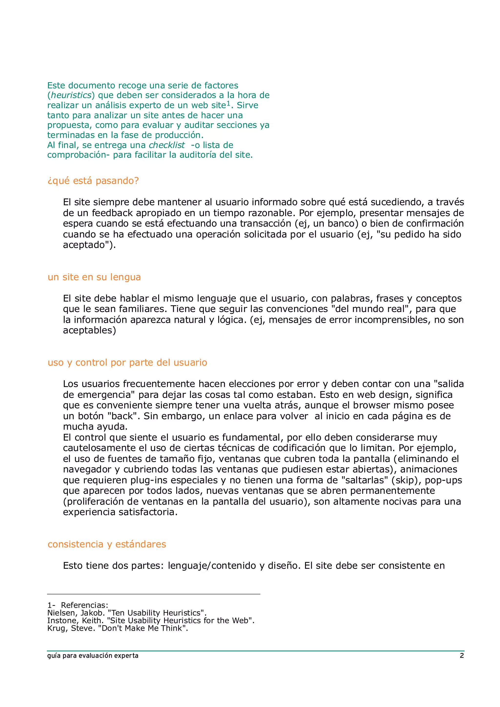Este documento proporciona una guía para la evaluación experta de sitios web. Incluye factores (heurísticas) que deben considerarse al analizar o auditar un sitio web, como la usabilidad, la interfaz, el contenido y la compatibilidad técnica. También incluye una lista de verificación para facilitar la auditoría. El objetivo es ayudar a analizar sitios web antes y durante su desarrollo para mejorar la experiencia del usuario.