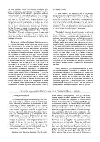 El documento resume el discurso de bienvenida del Papa durante su visita a Madrid para la XXVI Jornada Mundial de la Juventud en agosto de 2011. El Papa agradece la hospitalidad de España y Madrid. Explica que ha venido a encontrarse con los jóvenes para confirmarlos en la fe y animarlos a ser testigos de Cristo. También habla de los desafíos que enfrentan los jóvenes y la necesidad de ayudarlos a permanecer firmes en su fe.