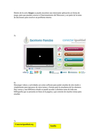 La página ConectarIgualdad ofrece programas de apoyo educativo, juegos de aprendizaje y reglas escolares para estudiantes, docentes, familias y directivos. También proporciona recursos como secuencias didácticas, videos, software y una biblioteca en línea con material para la enseñanza de varios temas. El sitio busca ser útil para todos los miembros de la comunidad educativa.
