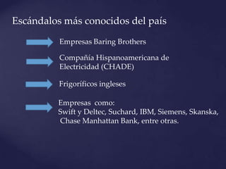 El documento habla sobre la larga historia de corrupción en Argentina. Menciona algunos escándalos de corrupción que involucraron a presidentes y funcionarios del gobierno en el siglo XIX y durante la década de 1930. También describe cómo una ONG llamada Transparencia Internacional mide la percepción de corrupción en diferentes países y en 2012 ubicó a Argentina en el puesto 102 de 174 países en su índice de transparencia.