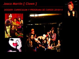 El documento presenta el currículum y programa de cursos de Joaco Martin como payaso y director teatral. Ha recibido una amplia formación en escuelas de teatro y payasada en París, Madrid, Ibiza y otras ciudades. Imparte regularmente cursos de payaso a todos los niveles y dirige la compañía "Clownas, Cía. de Payasas". El programa incluye cursos de introducción al payaso para enriquecer la actuación a través del juego y la improvisación.