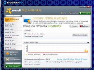 Este documento habla sobre los antivirus, programas cuyo objetivo es detectar y eliminar virus informáticos. Explica que los antivirus han evolucionado para bloquear y prevenir infecciones de malware como spyware y troyanos. También describe los métodos de contagio de virus e incluye una lista de los antivirus más efectivos actualmente como AVG, NOD32 y Avast.