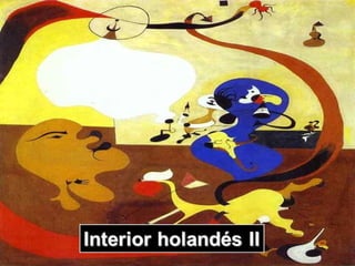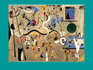 Joan Miró fue un pintor español surrealista. En su obra utilizaba formas desproporcionadas e imágenes oníricas para expresar ideas sobre la condición humana. También creó varias pinturas inspiradas en obras maestras holandesas del siglo XVII, a las que transformaba aplicando su estilo surrealista caracterizado por colores puros y formas distorsionadas. Miró creía que el arte debía servir a los hombres comunicando algo entre el silencio de los demás.