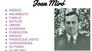 Joan Miró era un pintor español surrealista nacido en 1893 en Barcelona. Pintó en varios estilos como el impresionismo y el surrealismo, creando obras famosas como "Mujer, pájaro y estrella". Fundó su propia fundación en Barcelona para garantizar el acceso público a su obra. Tuvo una amistad cercana con Picasso a pesar de sus diferencias estilísticas. Vivió en varios países como España, Francia y EE. UU., donde creó importantes murales.
