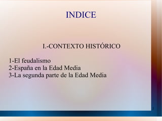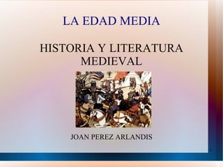 El documento resume la historia y literatura de la Edad Media en España. Explica el sistema feudal y el contexto histórico de la península ibérica durante ese periodo. Luego describe los principales géneros literarios de la época, incluyendo la lírica, mester de juglaría (como el Poema de Mío Cid) y mester de clerecía. También resalta las primeras obras escritas en lengua romance y los escritos de Alfonso X el Sabio y Don Juan Manuel.
