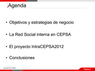 El documento resume las estrategias de negocio de CEPSA, incluyendo exploración y producción de petróleo y gas, refino y comercialización, química, gas y electricidad. Las estrategias se centran en la sostenibilidad, integración de negocios, desarrollo de sinergias internas, e impulso de la colaboración.