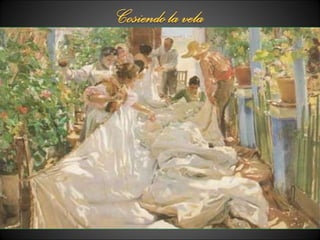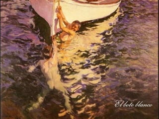 Joaquín Sorolla fue un pintor español del siglo XIX y principios del XX. Se formó en Valencia y Roma y su estilo cambió tras un viaje a París en 1894, cuando adoptó la pintura impresionista y comenzó a pintar al aire libre, capturando la luz y el color del Mediterráneo. Además de paisajes, pintó retratos y obras de denuncia social. Su estilo agradable y técnica impresionista le valieron numerosos encargos y éxito tanto en España como en Europa