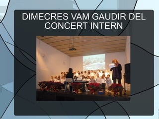 Este documento habla sobre los últimos 10 días del primer trimestre escolar, los cuales fueron muy especiales. El miércoles hubo un concierto internacional con Pingüinos y Osos y los estudiantes se esforzaron. El jueves cantaron para las familias y luego celebraron la fiesta del Tió, el cual se portó bien y les trajo regalos como cuentos, juguetes de hospital y motos, además de nueces y turrón. Para finalizar, disfrutaron de la historia del muñeco de nieve.