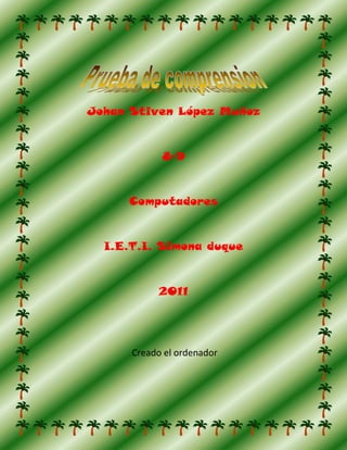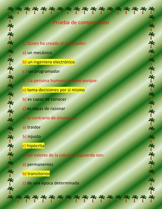 Este documento contiene un resumen de 3 oraciones sobre la creación del ordenador y una prueba de comprensión de 10 preguntas. El documento indica que los ordenadores fueron creados por ingenieros electrónicos y que, aunque las personas humanas fueron creadas, los ordenadores pueden perfeccionarse con el tiempo gracias a la capacidad humana de tomar decisiones, conocer y razonar. Finalmente, la prueba de comprensión contiene preguntas sobre conceptos como la sinceridad, los valores, la inteligencia y la generosidad.