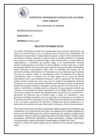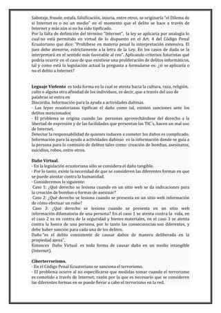 Este documento discute los desafíos actuales en la regulación de delitos informáticos en Ecuador. Explica que la legislación ecuatoriana no define términos clave como "internet" y "delito informático", lo que dificulta la aplicación de las leyes existentes. También argumenta que es necesario actualizar el código penal para incluir nuevos delitos como daño virtual, ciberterrorismo y privacidad de datos para proteger adecuadamente los derechos de los ciudadanos.