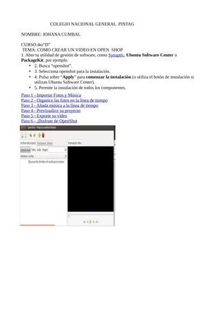 El documento describe los 5 pasos para crear un video en OpenShot: 1) importar fotos y música, 2) organizar las fotos en la línea de tiempo, 3) añadir música a la línea de tiempo, 4) previsualizar el proyecto, y 5) exportar el video finalizado. También incluye los 4 pasos para instalar OpenShot en Ubuntu.