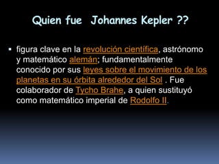 Johannes Kepler fue un astrónomo y matemático alemán que descubrió las tres leyes del movimiento planetario. Estudió con Tycho Brahe y heredó sus observaciones de Marte, las cuales mostraron que los planetas se mueven en órbitas elípticas y no circulares. Kepler también escribió sobre otros temas como horóscopos y ciencia ficción.