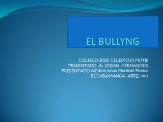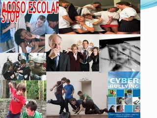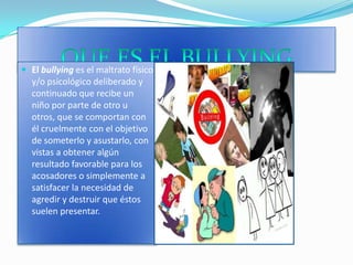 El documento habla sobre el bullying y el ciberbullying. Define el bullying como el maltrato físico y/o psicológico continuado que sufre un niño por parte de otros. Explica las formas de bullying físico, verbal y psicológico y cómo afecta esto a las víctimas y agresores. También define el ciberbullying y cómo se manifiesta a través de internet y redes sociales, las diferencias con el bullying tradicional, y las diversas categorías en las que puede presentarse.