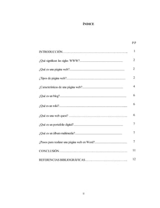 Este documento resume varios conceptos relacionados con páginas web. Explica que las siglas WWW significan World Wide Web, la red informática mundial. Define una página web como un documento electrónico alojado en un servidor que contiene información textual, visual o sonora accesible a través de navegadores. Describe diferentes tipos de páginas web según su construcción y tecnología, así como características importantes como la utilidad, navegabilidad y apariencia. También define conceptos como blogs, wikis, web quests