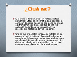 Una red inalámbrica permite la conexión de nodos sin necesidad de cables mediante ondas electromagnéticas. Tiene el beneficio de eliminar el cableado pero requiere una seguridad robusta para evitar intrusos. Bluetooth es una tecnología de transmisión inalámbrica de corto alcance que permite la conexión entre dispositivos móviles sin necesidad de antenas visibles.