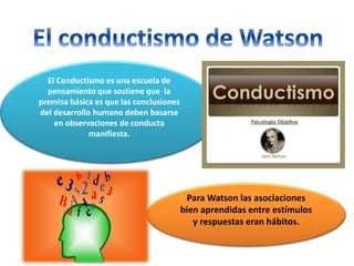 John B. Watson fue un psicólogo estadounidense y fundador del conductismo, la escuela de pensamiento que sostiene que el desarrollo humano se basa en la observación de la conducta manifestada y que los hábitos se forman a través de las asociaciones aprendidas entre estímulos y respuestas. Watson demostró que los temores infantiles son adquiridos y no innatos a través de un experimento en el que un niño asoció el sonido de una rata con el miedo después de verla.