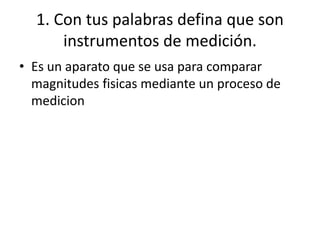 Los instrumentos de medición son aparatos que se usan para comparar magnitudes físicas mediante un proceso de medición. Las características de la medición incluyen la precisión y la sensibilidad.