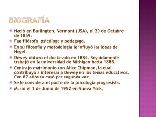 John Dewey fue un filósofo y psicólogo estadounidense que desarrolló una teoría pragmatista de la educación. Creía que la educación debía basarse en la experiencia y la resolución de problemas del mundo real mediante el método científico. Fundó una Escuela Experimental en Chicago en 1896 para poner en práctica sus ideas, centrando el aprendizaje en proyectos y la participación democrática de los estudiantes. Aunque tuvo éxito inicialmente, el proyecto terminó en 1904.