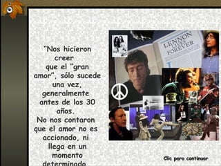 El documento critica las creencias comunes sobre el amor y la felicidad que se nos inculcan desde pequeños. Nos hacen creer que sólo existe una fórmula para ser felices como pareja cuando en realidad cada persona es única y puede encontrar la felicidad de diferentes maneras. También cuestiona ideas como que el amor verdadero sólo ocurre una vez antes de los 30, o que para estar completo necesitamos a otra persona. En realidad, cada uno nace completo y la felicidad viene de adentro, no de cumplir fórmulas preestablecidas