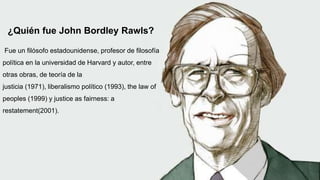 John Rawls fue un filósofo estadounidense conocido por su libro "Teoría de la Justicia" de 1971. En este libro, Rawls propuso dos principios de justicia basados en una "posición original" contractualista: 1) cada persona debe tener igual derecho a un esquema plenamente adecuado de libertades básicas iguales que sea compatible con un similar esquema de libertades para todos, y 2) las desigualdades sociales y económicas deben estar organizadas de forma que sean para el mayor beneficio de los menos favorecidos.