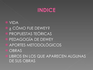 John Dewey fue un filósofo, psicólogo y pedagogo estadounidense que fundó la filosofía del pragmatismo. Abogó por una educación progresista basada en la experiencia y la resolución de problemas concretos. Propuso un método pedagógico de cinco fases que incluía la identificación de problemas reales de los estudiantes y la formulación e implementación de hipótesis para resolverlos. Escribió influyentes obras sobre educación, democracia, arte y otras áreas.