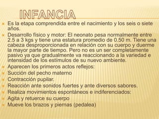 La etapa pre-natal se divide en tres periodos: el periodo zigótico en el que se forma el embrión, el periodo embrionario donde se desarrollan los sistemas corporales del feto, y el periodo fetal donde el feto termina de desarrollarse hasta el nacimiento.