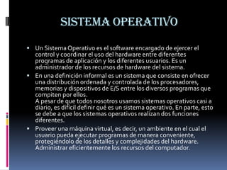 Este documento describe varios sistemas operativos incluyendo DOS, Windows, Mac OS, Linux y Unix. Explica que un sistema operativo controla y coordina el uso del hardware entre programas y usuarios. Luego procede a describir las características y funcionalidades clave de cada uno de estos sistemas operativos populares.