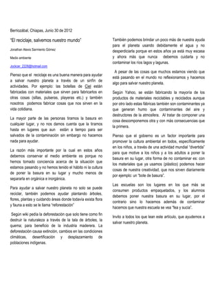 El documento habla sobre la importancia del reciclaje y la conservación del medio ambiente. Señala que el reciclaje ayuda a salvar el planeta al reutilizar materiales y fabricar nuevos productos. También enfatiza la necesidad de cuidar el agua y plantar árboles. Finalmente, invita a todos a poner su basura en su lugar y ayudar a preservar el medio ambiente.