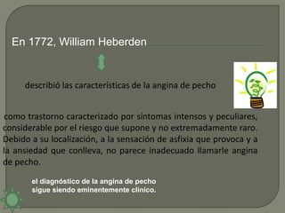 La angina estable crónica se manifiesta como dolor opresivo en el pecho provocado por el ejercicio físico o emociones que mejora con el reposo. Presenta seis signos característicos como la aparición gradual del dolor, su localización esternal, factores que lo precipitan como el ejercicio y factores aliviadores como el reposo. Se clasifica en cuatro clases dependiendo de qué actividad física provoca los síntomas.