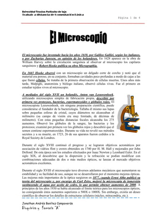 El microscopio fue inventado a principios del siglo XVII por Galileo Galilei y mejorado por otros científicos como Anton van Leeuwenhoek, quien descubrió bacterias y espermatozoides. Existen diferentes tipos como el microscopio óptico, que utiliza luz visible, y el microscopio electrónico, que usa un haz de electrones. El microscopio está compuesto principalmente por un objetivo, un ocular y tornillos micrométricos para enfocar la muestra.
