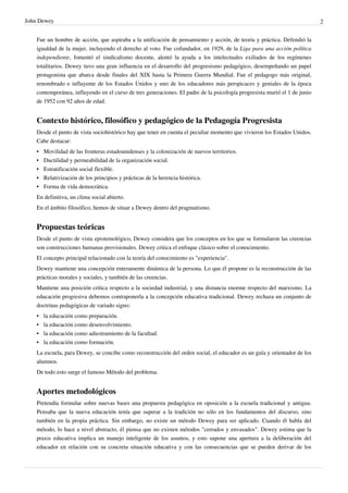 John Dewey fue un filósofo, pedagogo y psicólogo estadounidense que defendió la pedagogía progresista. Fue influyente en la educación estadounidense en el siglo XX promoviendo que la escuela se base en las experiencias de los estudiantes para resolver problemas. Propuso que los estudiantes aprendan haciendo actividades funcionales y resolviendo problemas reales en lugar de aprender de forma pasiva. Tuvo un gran impacto en la educación progresista en los Estados Unidos.
