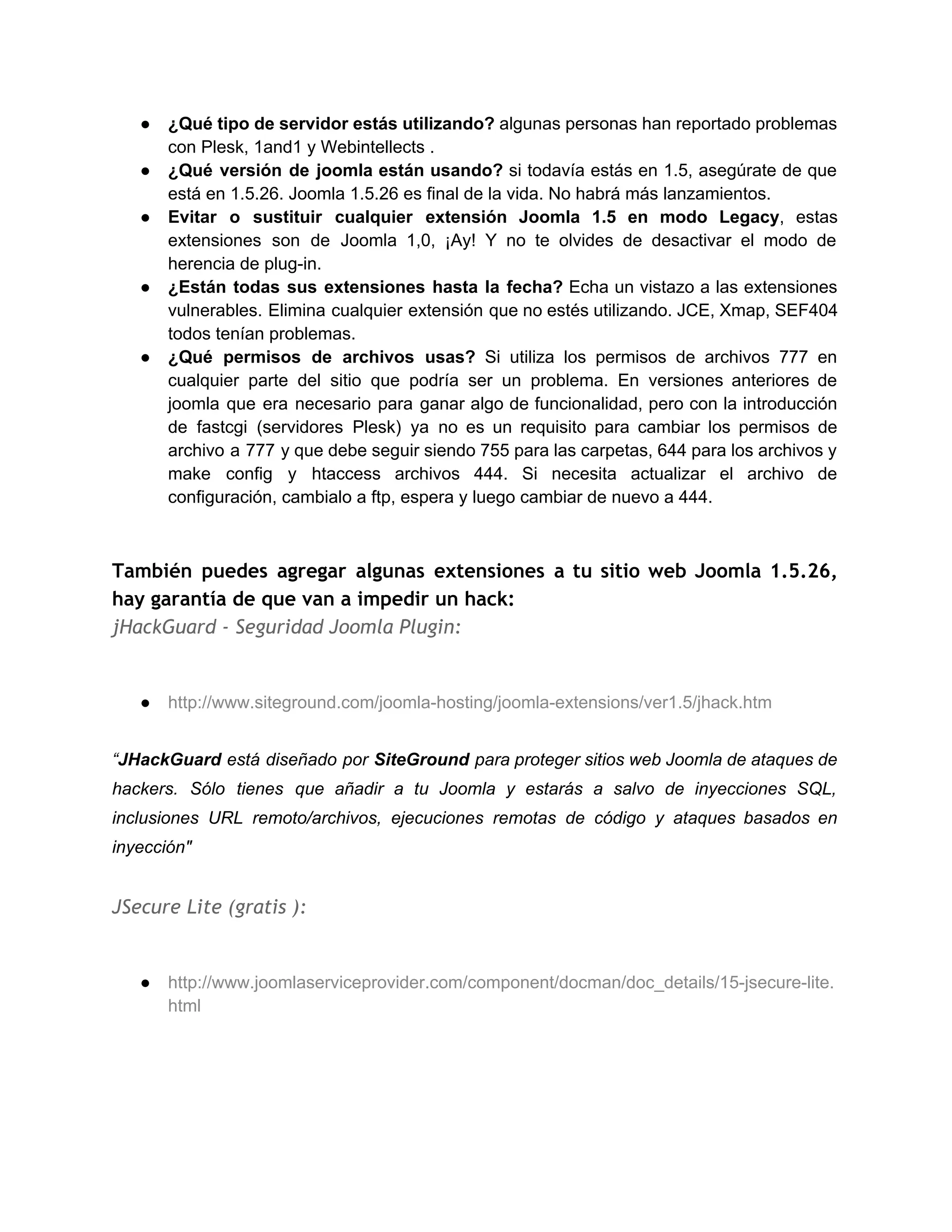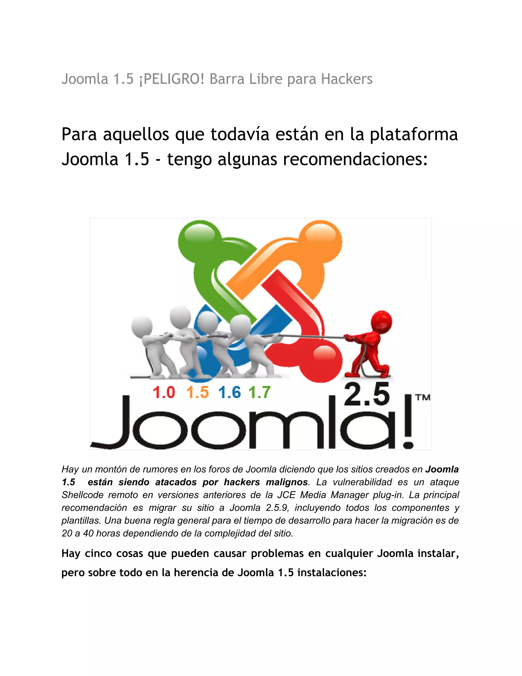 El documento advierte a los usuarios de Joomla 1.5 sobre vulnerabilidades de seguridad y recomienda actualizar a Joomla 2.5.9 e instalar extensiones como jHackGuard y JSecure Lite para proteger el sitio de ataques, ya que Joomla 1.5 ya no recibirá más actualizaciones. También proporciona enlaces a recursos para escanear el sitio, verificar extensiones vulnerables y convertir plantillas de Joomla 1.5 a 2.5.