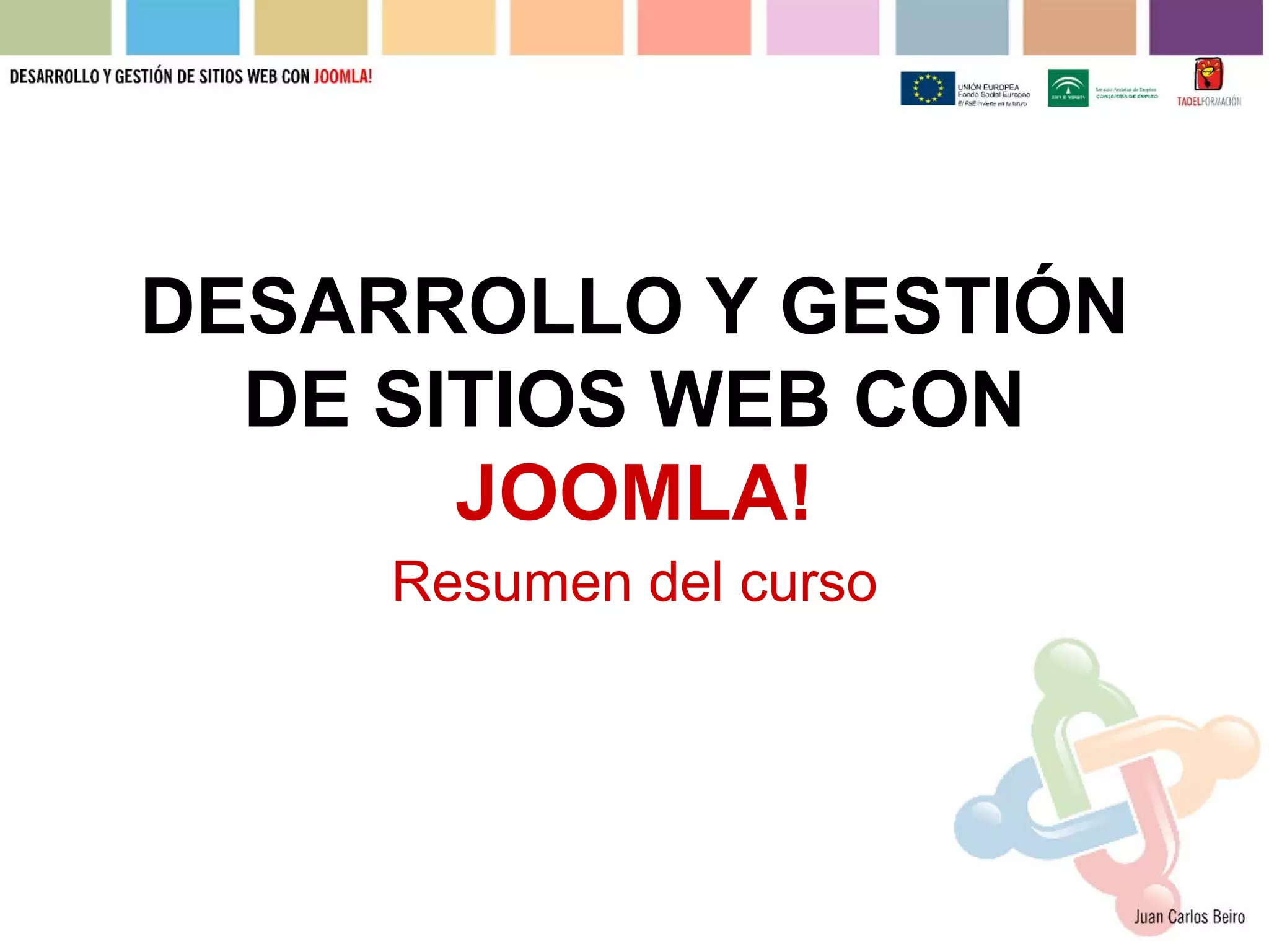 Este documento resume las características principales de Joomla!, un sistema de gestión de contenidos. Joomla! permite crear sitios web flexibles con contenido que puede administrarse fácilmente. Los usuarios pueden acceder al contenido a través de menús y módulos, y ampliar las funciones del sitio con componentes, extensiones y plantillas. El documento también explica cómo instalar y administrar un sitio Joomla!, incluida la configuración, copias de seguridad y permisos de usuario.